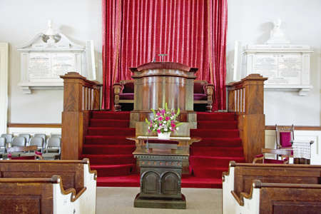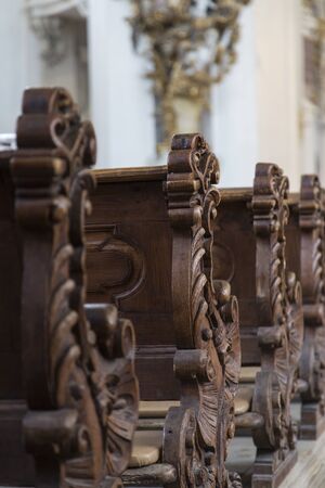Interior of a Christian temple with wooden furniture made by master craftsmen