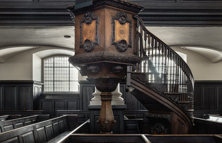 London, UK - Jul 21, 2025 - Ornately carved wooden pulpit with an attached staircase, which is located in St Martin-in-the-Fields. use it as your Wallpaper, Poster and Space for text, Selective focus.