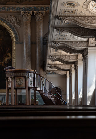 London, UK - Jun 18, 2025 - the ornately carved wooden staircase that gracefully ascends to the pulpit interior of the Chapel of St Peter & St Paul, is known for its neoclassical interior, which is part of the Old Royal Naval College in Greenwich, use it as your Wallpaper, Poster and Space for text, Selective focus.