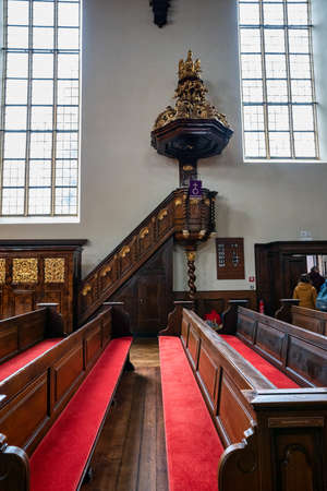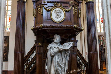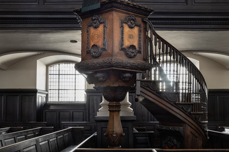 London, UK - Jul 12, 2025 - Ornately carved wooden pulpit with an attached staircase, which is located in St Martin-in-the-Fields. use it as your Wallpaper, Poster and Space for text, Selective focus.
