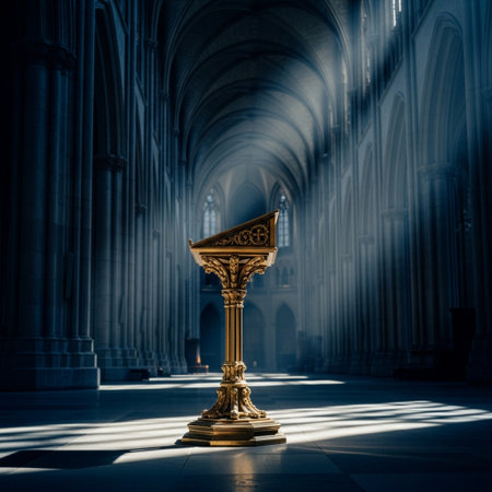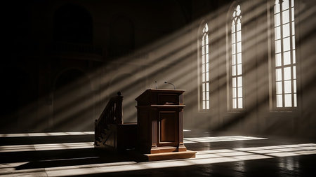 A wooden lectern with a microphone stands in a grand, dimly lit hall, illuminated by dramatic shafts of sunlight streaming through large arched windows.