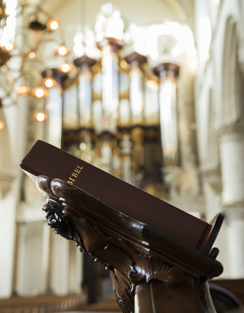 Old Vintage German Bible on Pulpit in European Medieval Church Close up Blurred Background and Copy Space
