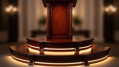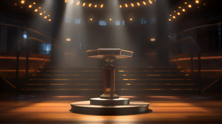 A polished wooden podium stands center stage under a dramatic spotlight in a dimly lit, ornate room with classical architectural details.