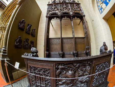 Wooden Traditional Confessional with Curtain inside a Historic Church.