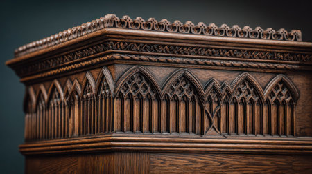 A detailed close-up shows a carved wooden panel featuring repeating Gothic arch designs and ornate embellishments. The warm brown tones of the wood contrast against a softly blurred background. The composition highlights the craftsmanship with a focus on texture and form, suitable for artistic or historical contexts.