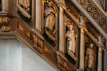 Riga, Latvia. Interior Of The Riga Dom Dome Cathedral Church. Decorative Elements, Statues On The Pulpit