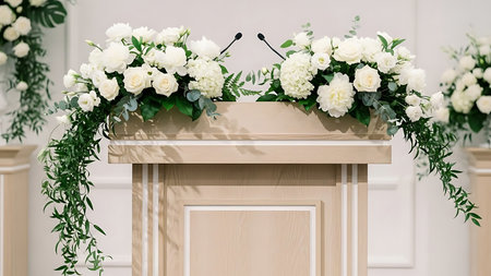 Flowers on a wooden tribune. Wedding ceremony. 3d rendering