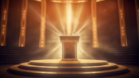 An empty wooden podium with a microphone stands center stage, bathed in a dramatic spotlight against a dark background.