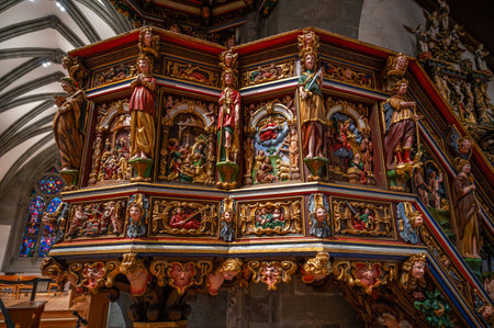 Stavanger Domkirke, Norway, richly decorated wooden pulpit adorned with intricate carvings and statues stands in a Gothic church, featuring vibrant colors and detailed religious scenes