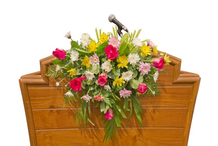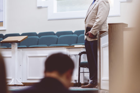 A male in a formal outfit preaching the Holy Bible from the tribune at the altar of the church