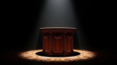 A dark wooden podium with classical details is dramatically lit by a single spotlight from above against a black background.