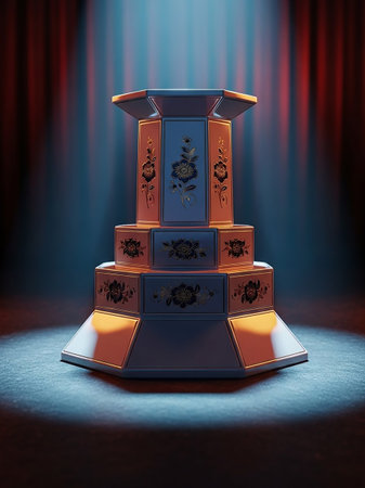An ornate octagonal pedestal with floral patterns is dramatically lit with blue and red spotlights, casting shadows on a textured surface.
