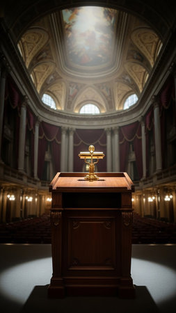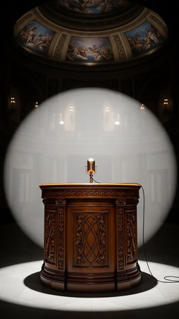 An ornate wooden podium with a vintage microphone sits center stage, bathed in a dramatic spotlight. The dark, grand hall a frescoed dome ceiling, creating an atmosphere of historical significance...