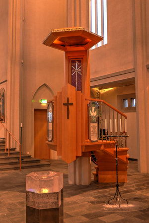 The interior is inside The Church of Hadlgrimskirkya, a Lutheran church in Reykjavik, the capital of Iceland.