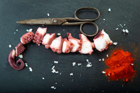 Fresh raw octopus. Concept healthy food, Mediterranean diet and seafood. Top view.