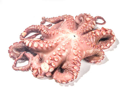 Top view of raw octopus isolated on a plain white background, focusing on natural form and slimy surface details