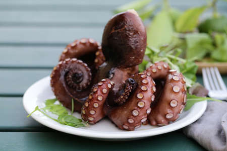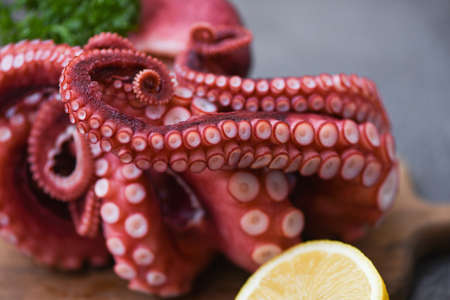 Boiled octopus tentacles with lemon on plate background, Octopus food cooked salad seafood squid cuttlefish dinner restaurant