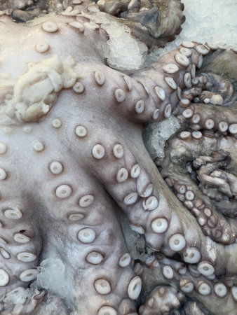 A vibrant close-up of fresh octopus displayed on ice at a seafood market. The vivid colors and intricate textures highlight its natural beauty, perfect for culinary inspiration.