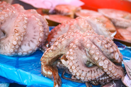 Freshly-Caught Octopus on Display at a Bustling Seafood Market Stall, Showcasing Ocean Bounty