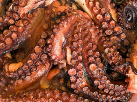 Macro shot of whole frozen octopus legs or big tentacles. Raw iced seafood, squid, calamari or cuttlefish texture closeup