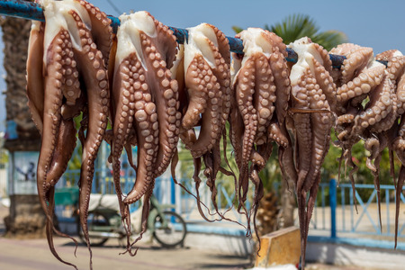 sun dried octopus hanging on a rope in local cafe, Santorini Greece