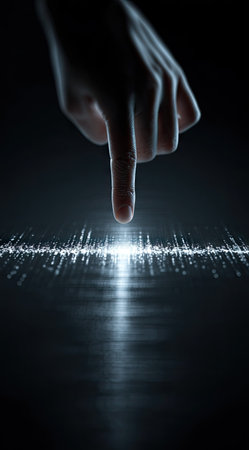 A finger delicately interacts with a glowing line, suggesting digital connection. The composition highlights a dark, reflective surface with a dynamic light source. The image has a modern aesthetic, suitable for projects exploring technology, communication, and innovative concepts. It is suitable for various editorial and commercial applications.
