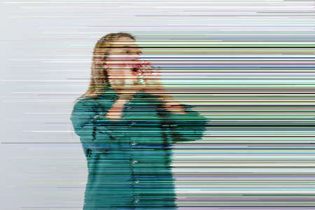Distorted digital glitch effect with scan lines and retro television aesthetics