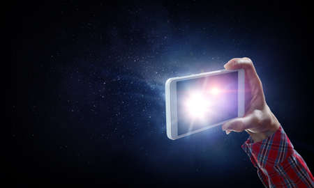 Conceptual hand writing showing photo. Concept meaning defined as produced by light, image taken with the help of light. Modern gadgets white screen under colorful bokeh background