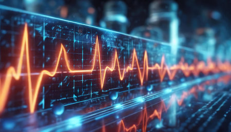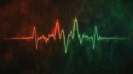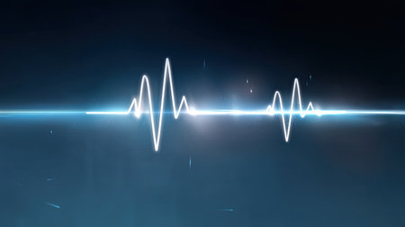 This abstract illustration features a glowing waveform on a dark background. It symbolizes health, technology, and energy, perfect for digital projects.
