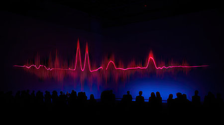 An abstract image depicts a red sound wave form above a crowd silhouette. The composition features contrasting colors and a dark environment, suggesting a stage or performance. The image may be used for a variety of purposes including art, design, or conceptual representations.