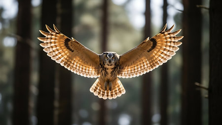 Majestic Bird of Prey in Flight against Misty Forest Background, Wild Raptor Soaring with Outstretched Wings in Natural Habitat AI Generative