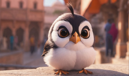 A small, animated penguin sits on a ledge with a serious expression