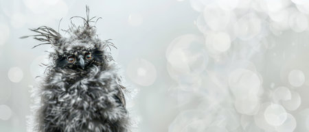 A small, dark owl stands against a backdrop of soft, blurry light, its feathers ruffled and damp from the recent rain. The owl is looking directly at the camera with wide, dark eyes, creating a sense of intensity despite its small size. The background is a hazy blend of white and grey, suggesting a misty morning.