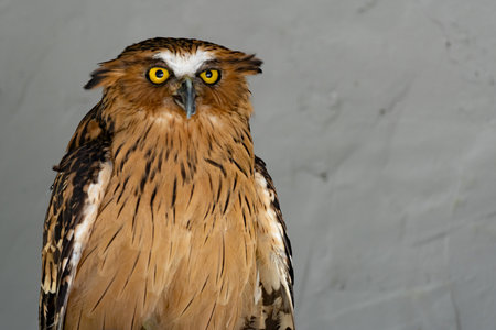 An owl with large yellow eyes looks at the camera. Night-bird. Surprised look. Predatory bird. Animal protection.