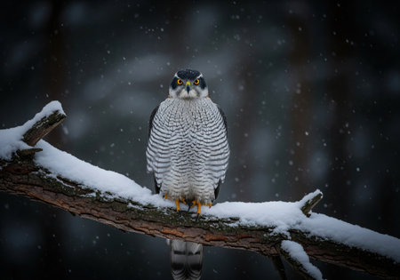 A Eurasian sparrowhawk with intense yellow eyes is perched on a snowy tree branch in a dark forest during a winter snowstorm.