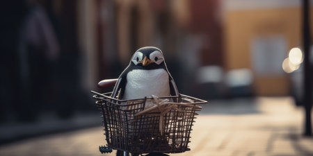 penguin have fun bicycle ride on sunshine day in summer on town street