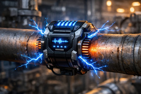 Device emits electric sparks while secured to a metal pipe in a complex industrial environment filled with machinery and technology.