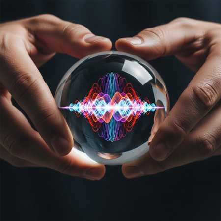 Close-up of hands cradling a flawless glass sphere containing multicolored quantum interference patterns, symbolizing advanced superposition computation.