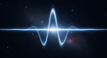 A conceptual visualization of a gravitational wave or energy pulse propagating through the vastness of space. A single, luminous blue waveform travels along a central axis against a dark background filled with stars and a distant nebula. This image represents concepts in physics, astrophysics, cosmology, and the detection of cosmic events.