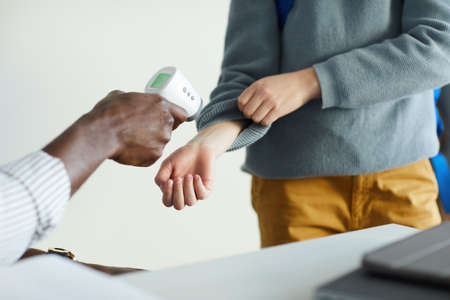Close up of male teacher checking temperature of children entering classroom in school