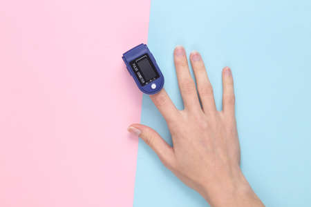 Hand finger with a pulse oximeter on a blue-pink pastel background. Measure the saturation of hemoglobin with oxygen in arterial capillary blood.