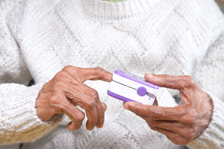 hands of an elderly woman holding a pulse oximeter.measuring oxygen saturation with a pulse oximeter. Health concept.