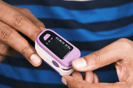 Man using finger pulse oximeter, healthcare monitoring concept. Pulse oximeter on a background