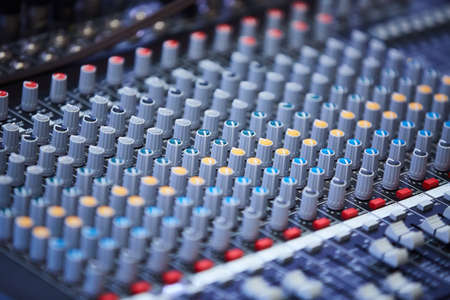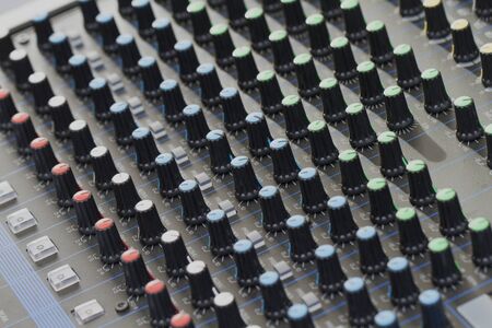 Professional Audio dj mixer console, sound tools and gear, studio equipment picture, selective focus picture of faders and knobs of mixer