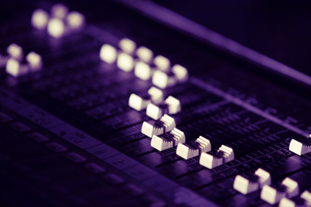 Sound mixing board with focus on the audio sliders for level from musical instruments