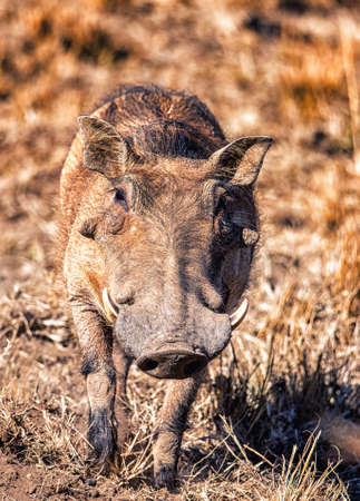 Warthog with big teeth walking among dry short grass