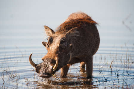 Brown hairy warthog in the water of a river