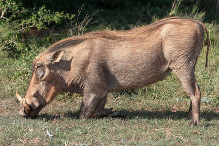 Common Warthog (Phacochoerus africanus) on its Knees, Grazing. Lake Mburo, Uganda