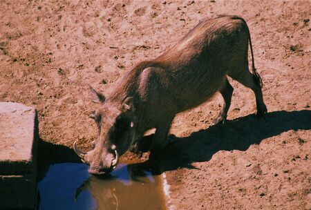 Picture in frog perspective of a male common warthog standing in a pool for a drink