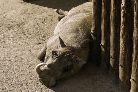 Portrait of big ugly Warthog resting in zoo